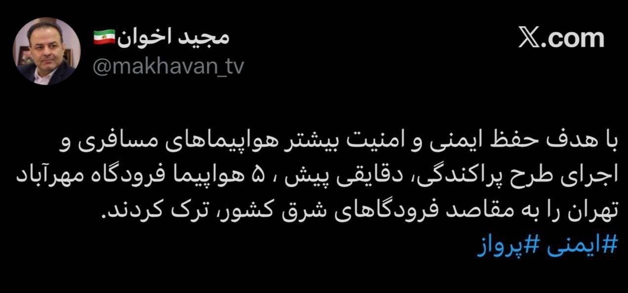 براساس اعلام مجید اخوان سخنگوی سازمان هواپیمایی کشور با توجه به شرایط کشور و با هدف حفظ ایمنی و امنیت بیشتر هواپیماهای مسافری و اجرای طرح پراکندگی،دقایقی پیش 5 هواپیمای فرودگاه مهرآباد تهران را به مقصد فرودگاههای شرق کشور ترک کردند.