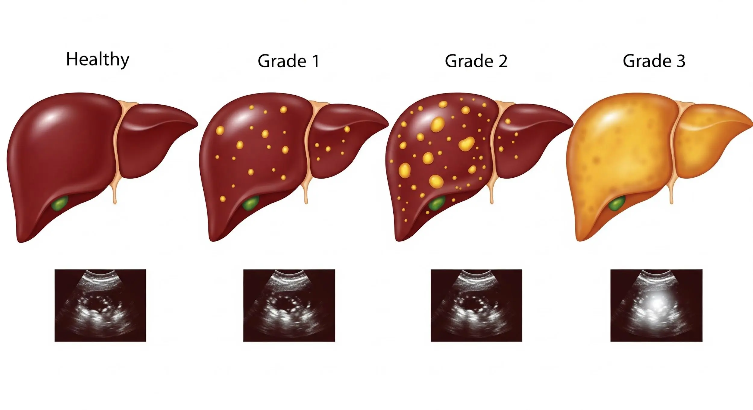- گرید ۳ یا شدید: بافت کبد آنقدر چرب و روشن است که بخشهای عمیق و دیافراگم به سختی دیده میشوند.