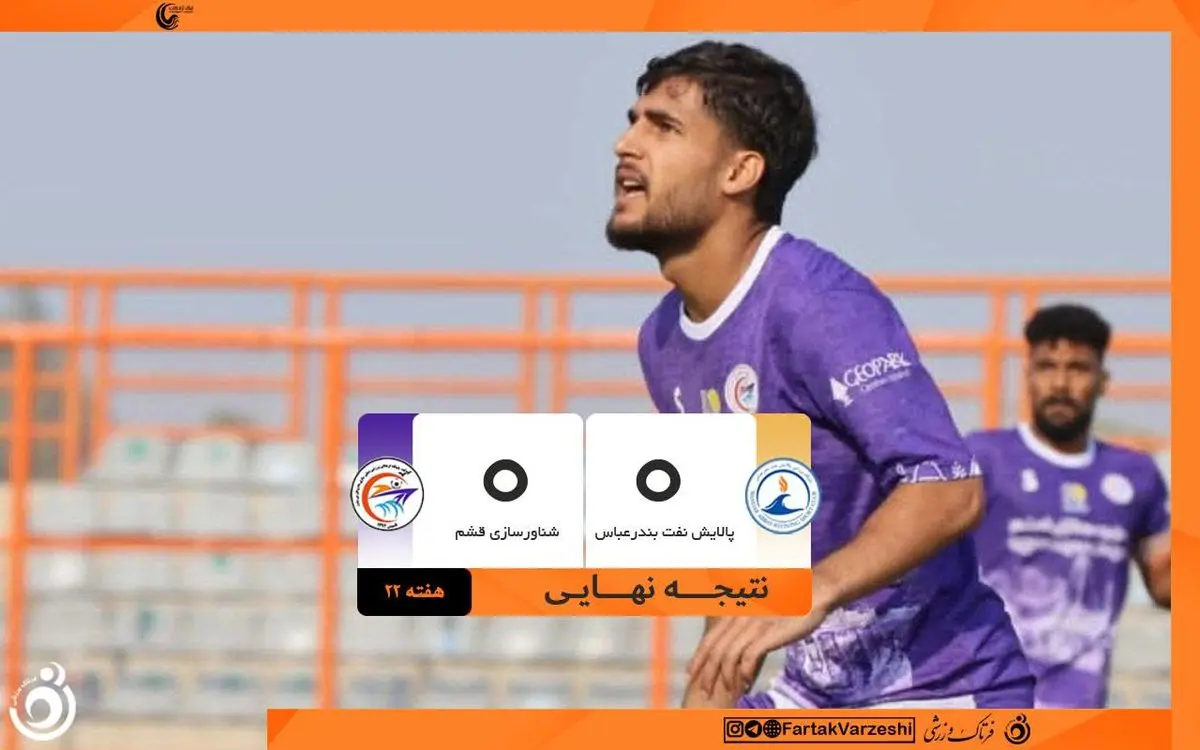 دیدار تیمهای پالایش نفت بندرعباس و شناورسازی قشم در هفته بیستودوم لیگ دسته اول با تساوی بدون گل به پایان رسید تا فرشاد پیوس و شاگردانش در یک بازی خارج از خانه به امتیازی مهم دست پیدا کنند.
